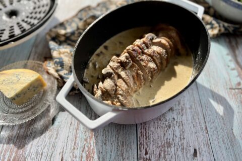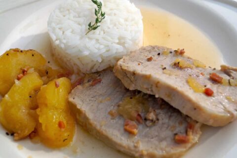 Plat parfait pour un dimanche d’automne, ce rôti de porc aux pommes, lardons, échalotes et thym vous régalera à coup sûr!