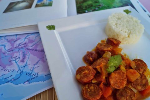 Spécialité réunionnaise à base de saucisses fumées cuites dans une sauce tomate aux épices