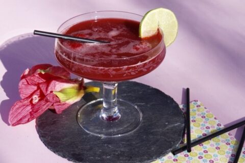 Cocktail à base de rhum antillais, jus de fraise, citron vert et menthe fraîche