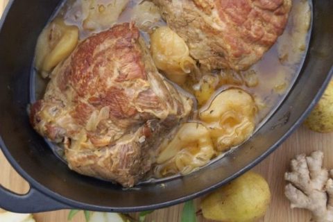 Échine de porc cuite longuement au four en cocotte à feu doux avec des poires, du gingembre, des herbes et du bouillon