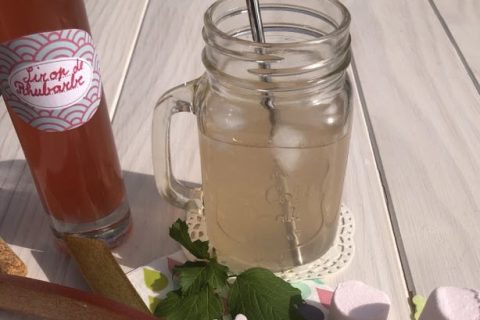 Sirop anti-gaspillage alimentaire préparé avec les épluchures de rhubarbe, à servir allongé avec de l’eau plate ou pétillante