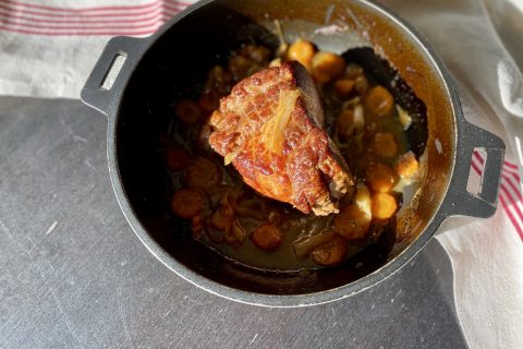 Viande de porc fondante longuement cuite au four avec du vin blanc, des carottes et des aromates