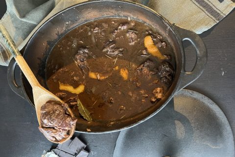 Des morceaux de porc très tendres cuits longuement au four dans une sauce au vin rouge, parfumée aux épices, orange et chocolat noir