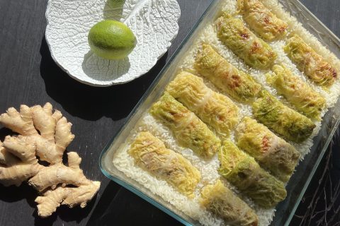 Feuilles de chou garnies d’une farce à la viande porc parfumée au citron vert, combawa et gingembre