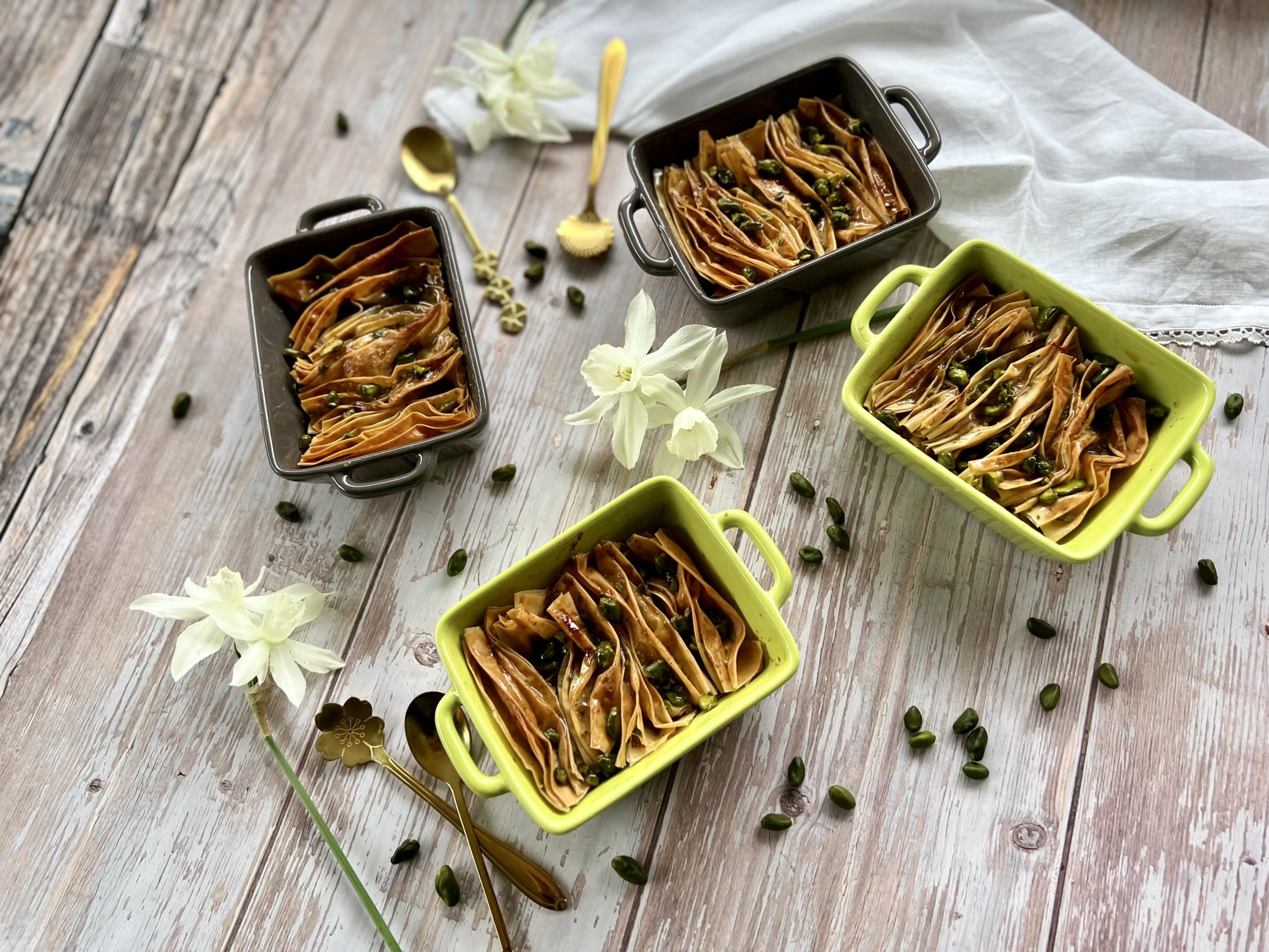 Gâteau composé de feuilles de filo froissées, garnies d’une crème aux épices, parsemé de pistaches et glacé d’un sirop à la fleur d’oranger