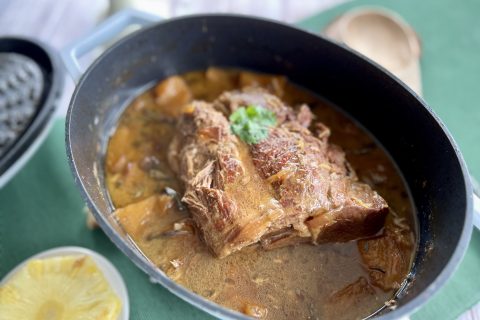 De l’échine de porc cuite longuement en cocotte dans un bouillon parfumé au gingembre, à la sauge et à l’ananas