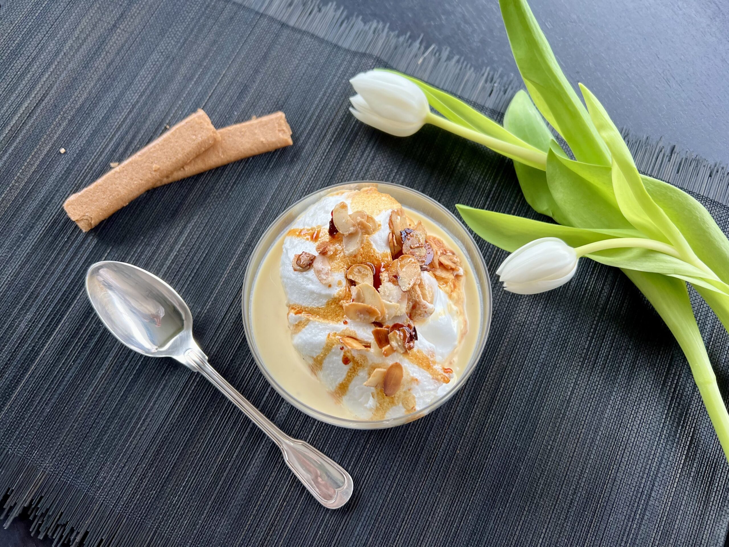 Blancs d’œufs montés en neige légèrement cuits et caramélisés, déposés sur un lit de crème anglaise