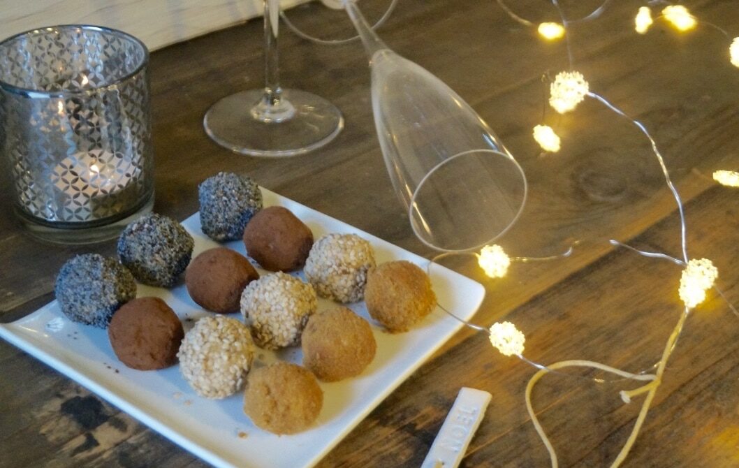 Truffes apéritives composées de boules de foie gras roulées dans divers topping: graines, poudre de spéculos, fruits secs, cacao, etc…