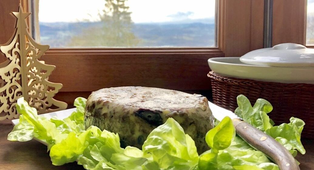Terrine festive qui change, associant le foie gras, le confit de canard et les pruneaux trois ingrédients typiques du Sud-Ouest