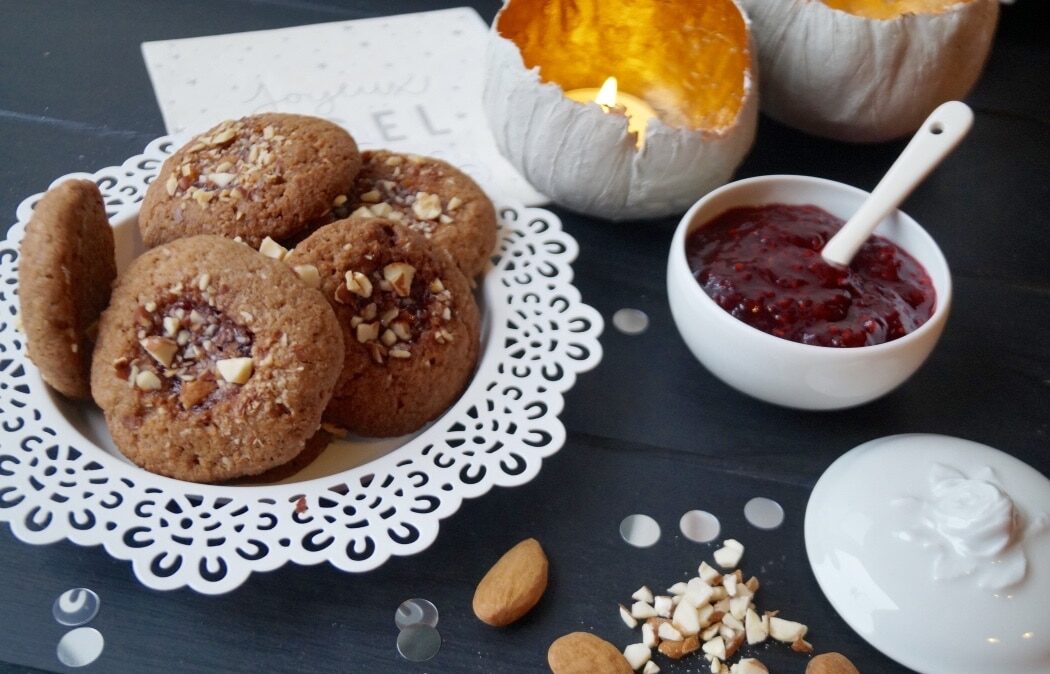 Biscuits de Noël composés d’une pâte aux amandes, chocolat et épices garnie de confiture de framboises et d’amandes hachée