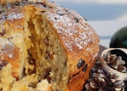 Brioche de Noël italienne parfumée au citron et à la vanille garnie de raisins secs au rhum et dés d’écorce d’orange confite