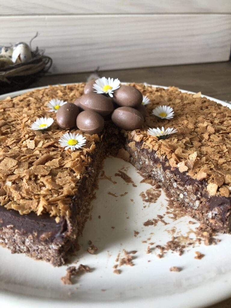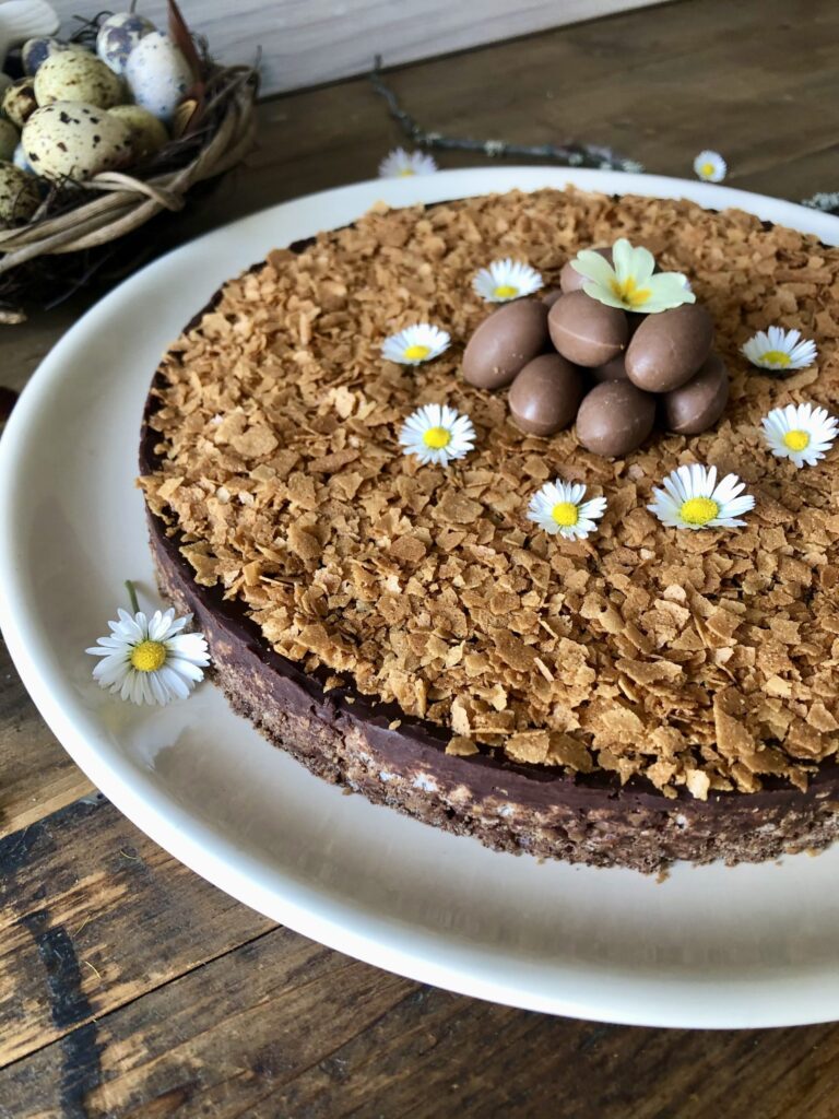 - Au moment de servir, écraser 6 crêpes dentelles, les répartir sur le gâteau et décorer avec des petits oeufs de Pâques et pourquoi pas quelques fleurs sauvages.