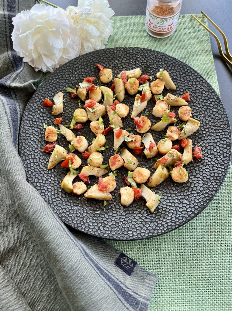 Ici je les ai associés à des pétoncles, des tomates confites, de l’ail, du piment d’Espelette et du basilic, un régal prêt en 5 mn sain et délicieux 😋.