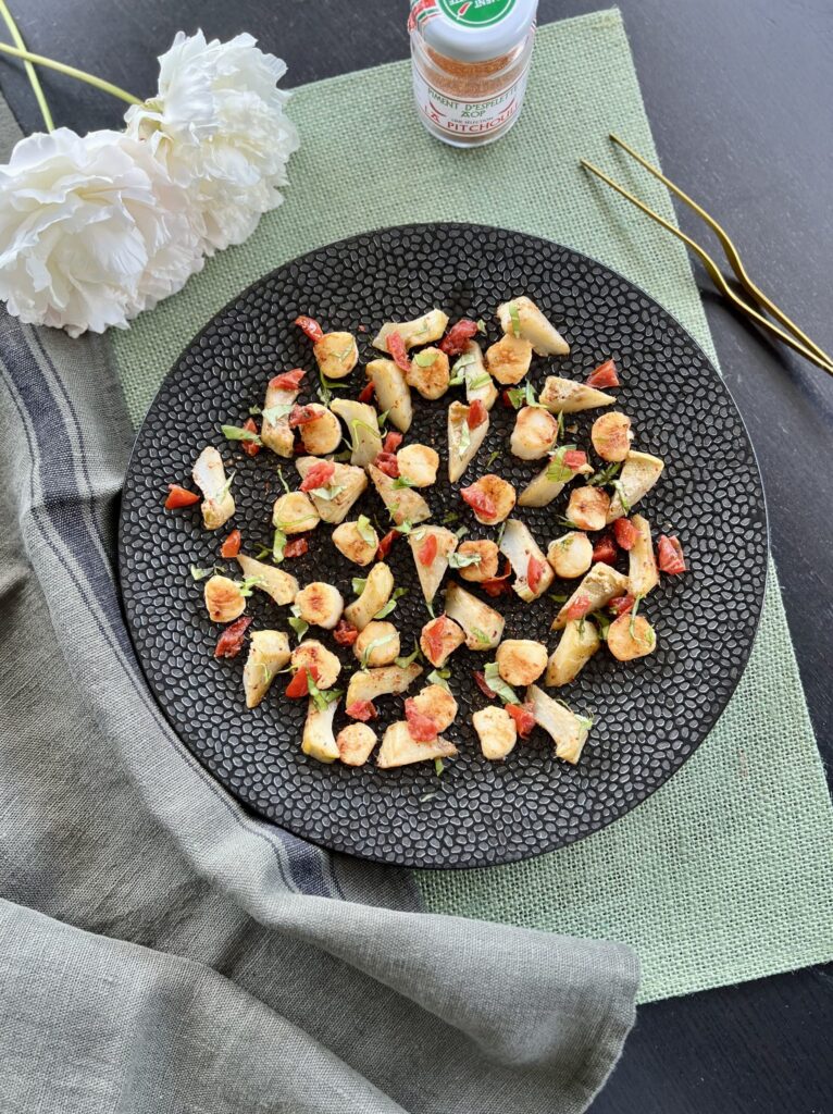 kcalPlat unique associant des noix de pétoncle avec des morceaux de coeurs d'artichaut et des pétales de tomates confites