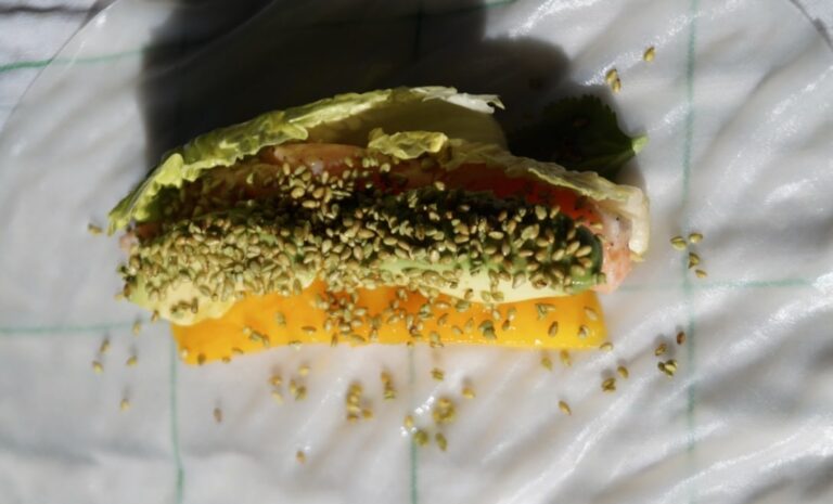 - Sortir le saumon du frigo, déposer 3 ou 4 petites feuilles de coriandre au 2/3 supérieur de la feuille de riz au centre, ajouter une feuille de salade, puis un morceau de saumon mariné, un bâtonnets de mangue et un d’avocat, parsemer le tout de graines de sésame.