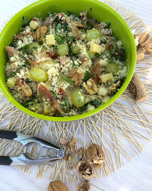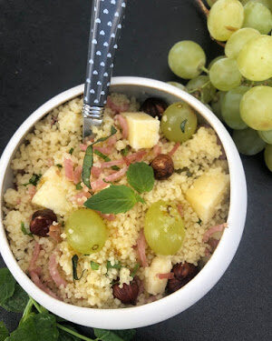 Taboulé d'automne au raisin, jambon, fruits secs et fromage